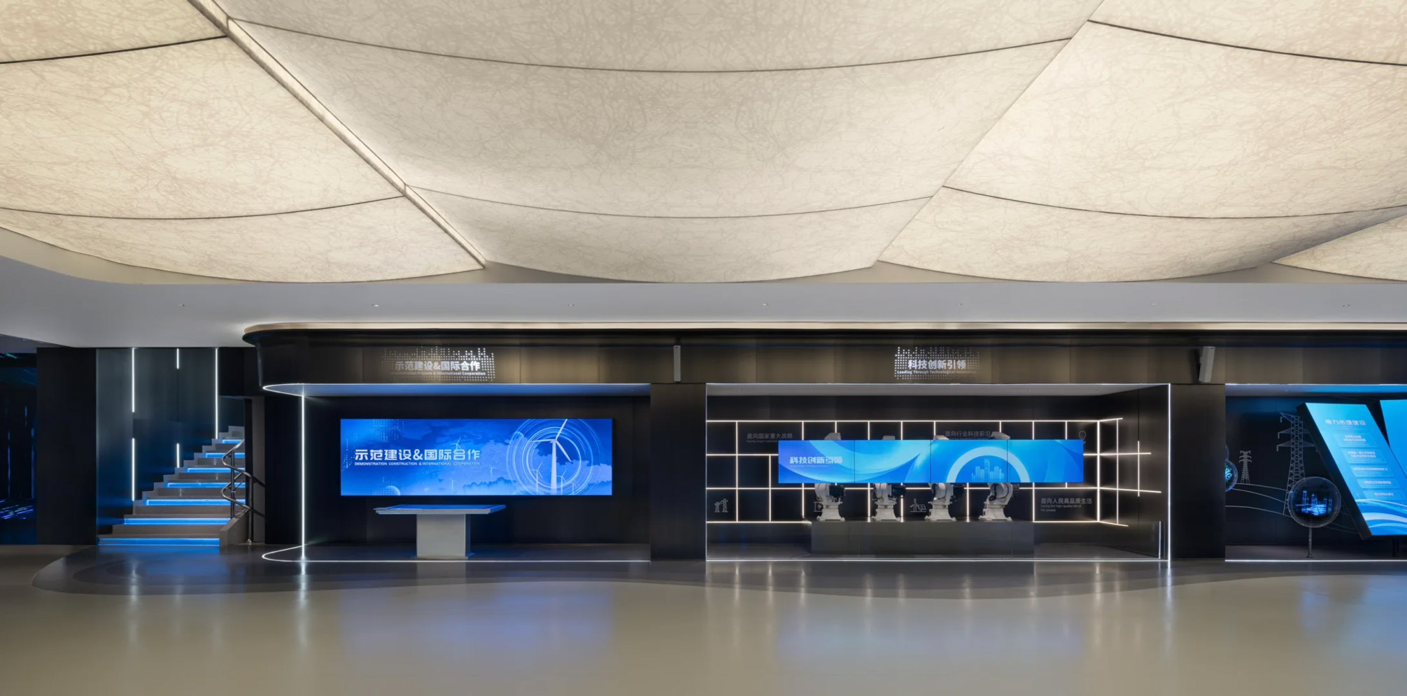 主展区沿墙面布置数字展项,融合层叠巨浪的造型,形成通厅式布局,弱化参观动线限制。内浅外深的配色既平衡了数字展项的冷峻感,又营造出会客厅般的舒适氛围。